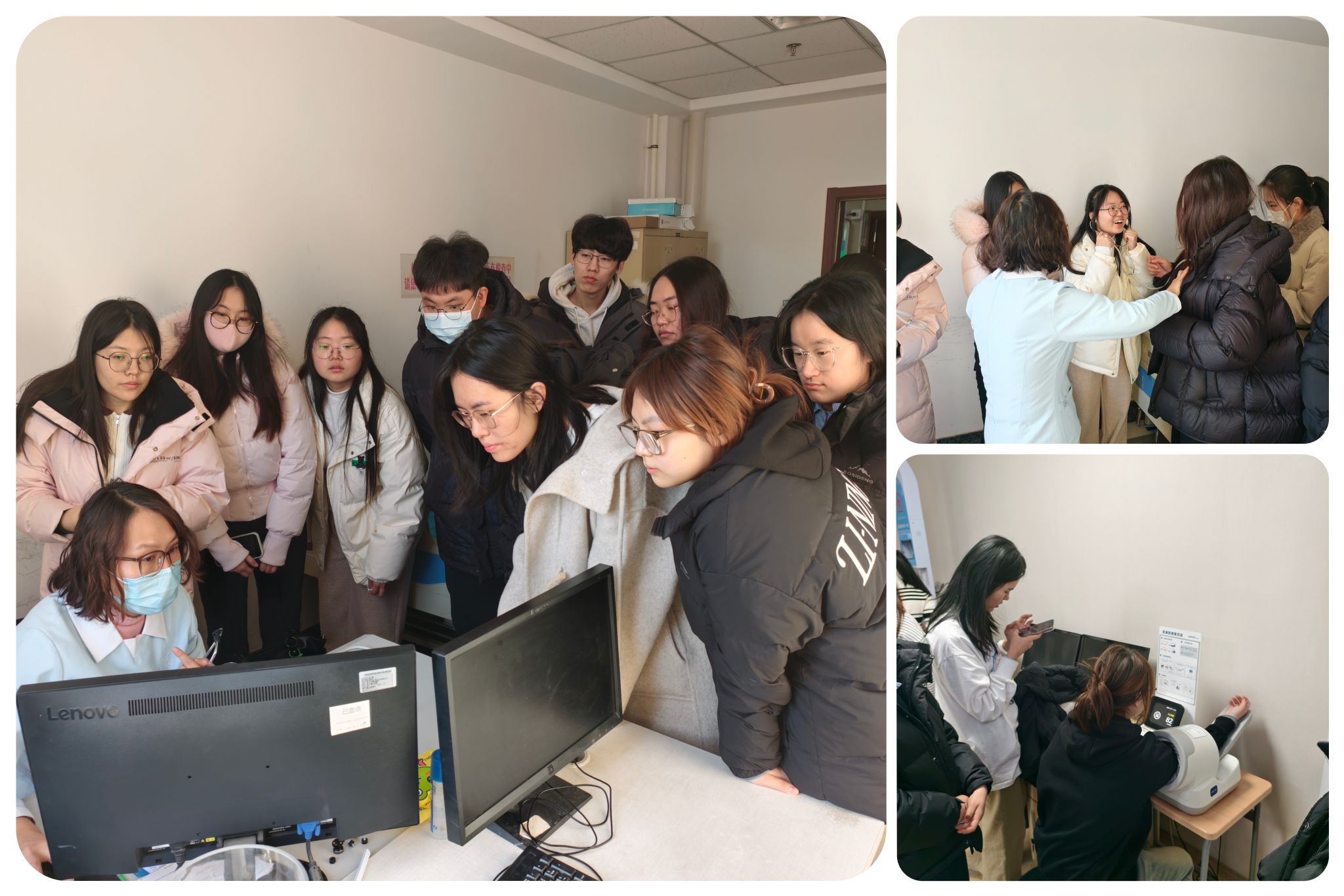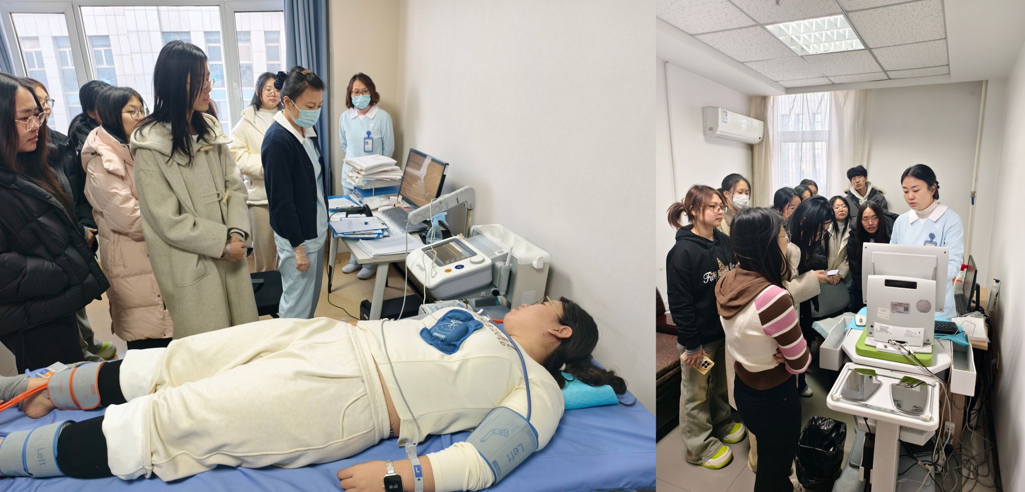 在健康管理中心医护人员的专业指导下,学生们分组有序地观摩并体验了多项核心健康检查项目。从心电图检查、脑卒中风险筛查,到动脉硬化检测、糖尿病早期筛查,同学们在真实场景中理解了疾病早期筛查的技术路径与健康风险干预的逻辑,实现了从书本知识到临床认知的重要跨越。