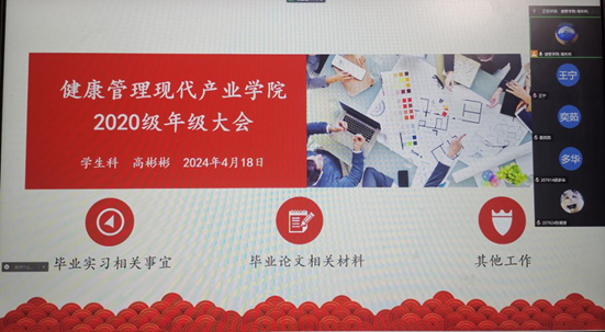 为深入学习贯彻党的二十大精神,落实党中央、国务院和省教育厅对高校2024届毕业生工作的决策部署,全面推进2024届毕业生日常管理和毕业相关工作,健康管理现代产业学院于2024年4月18日召开2024届毕业生年级大会。健康管理现代产业学院书记唐峭石、教务科科长吴琼老师、学生科副科长高彬彬老师和辅导员陆莹莹老师以及2024届全体毕业生参加会议。