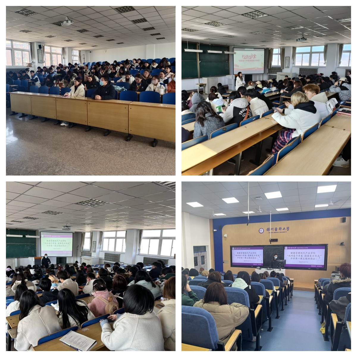根据《beat365唯一官网入口开展“赓续雷锋精神 奋斗成就梦想”2024年春季“开学第一课”活动方案》要求,健康管理现代产业学院围绕“家国情怀”“集体主义”“团结精神”“使命担当”等关键词以年级为单位,利用3月6日、7日两天开展“砥砺奋斗青春强国复兴有我”主题班团会暨年级大会,以青年学子讲述榜样故事的形式凝聚新学期奋发向上的精神力量,同时学生科就新学期开学的相关事宜从日常管理、寝室卫生、安全用电、请销假和学风建设几个方面以及本学期的重点工作向同学们作了通报,2021级、2022级、2023级全体同学以及学生科高彬彬老师、路莹莹老师参与。
