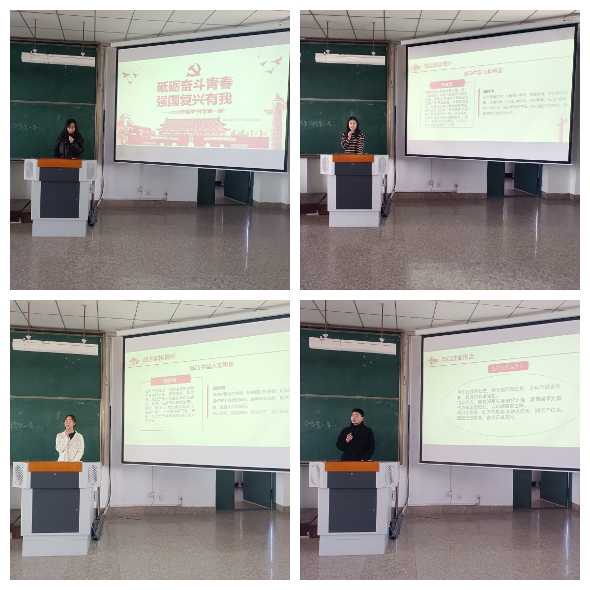 班团会伊始,各年级主题班团会首先从感念家国情怀、坚持集体主义、发扬团结精神和牢记使命担当四个部分展开,希望通过榜样的故事加强新时代青年的责任担当意识。其次,由退役复学学生彭凯歌向同学们讲述他参军入伍的动机以及在部队的收获,从海拔4000多米的岗哨到6000多米的雪山,让他对“人民子弟兵”这五个字有了更深刻的理解,哪有什么岁月静好,只是有人替你负重前行。再次,由高彬彬老师向大家通报了学院本学期的重点工作,并代表学院对同学们新学期的学习和生活从日常管理、寝室卫生、安全用电、请销假和学风建设五个方面进行了相应的要求。最后,学生科高彬彬老师寄语所有在座的学生:“一年之计在于春,一日之计在于晨,为了同学们美好的未来,在方方面面提升自己,是你们的首要任务!”